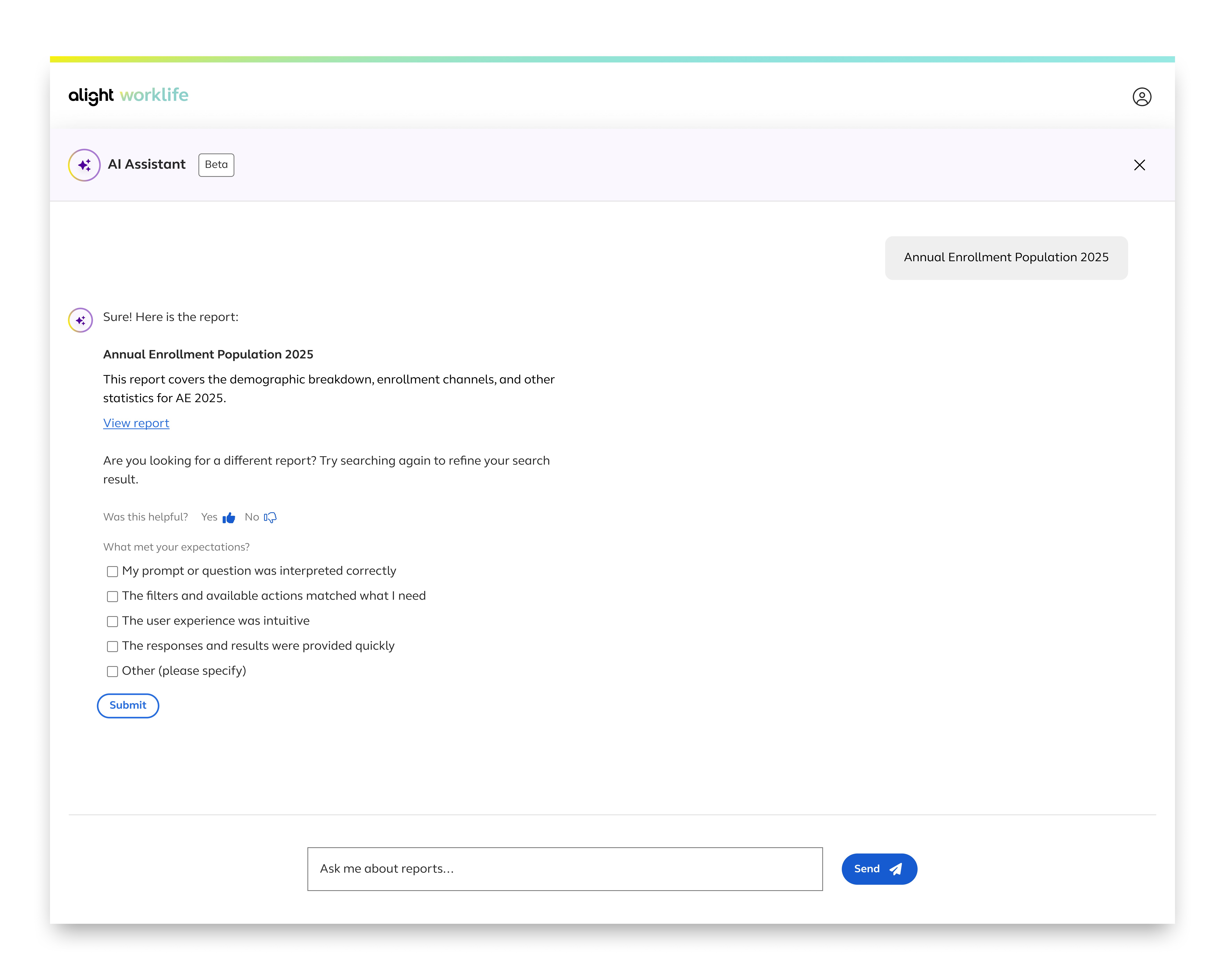 Alight Assistant is a generative AI chatbot embedded within Alight Worklife Insights®️, an analytics platform designed to help clients make sense of employee data across benefits, payroll, savings, and more. This AI-powered experience serves as a virtual assistant, streamlining complex workflows and enhancing user interaction within the analytics tool.
