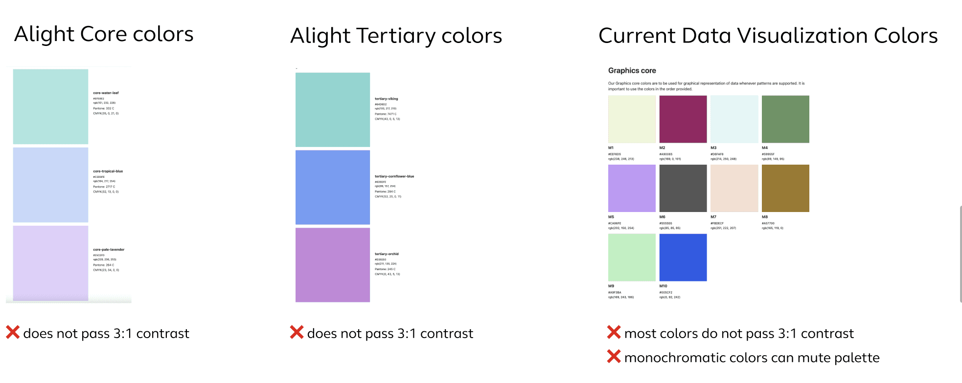 Before technical research began, I established a clear narrative linking the new color palette to Alight’s brand identity, reinforcing that the choices were intentional rather than arbitrary. This helped build stakeholder confidence and address concerns about aesthetic appeal by grounding the palette in an existing brand.
