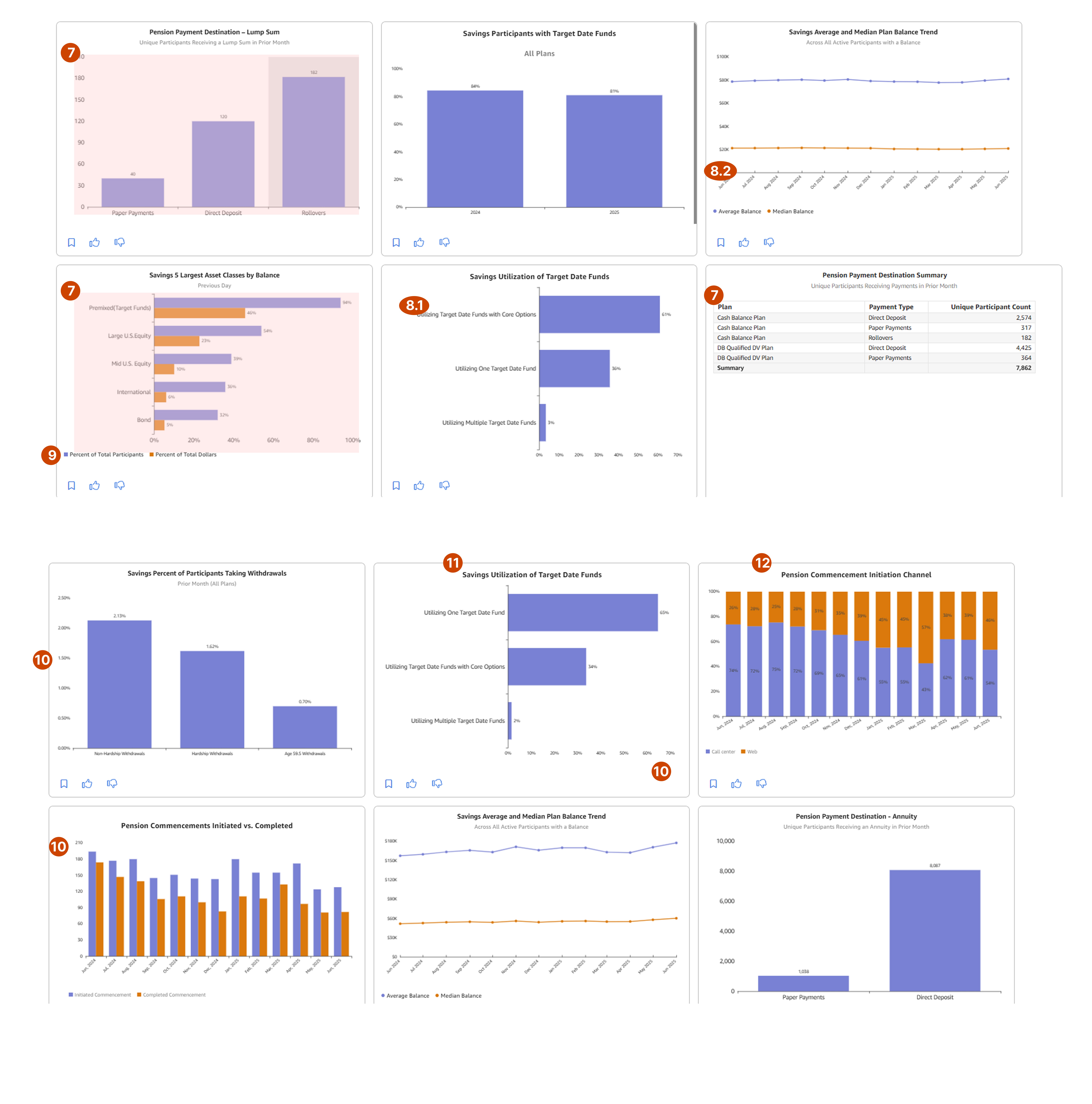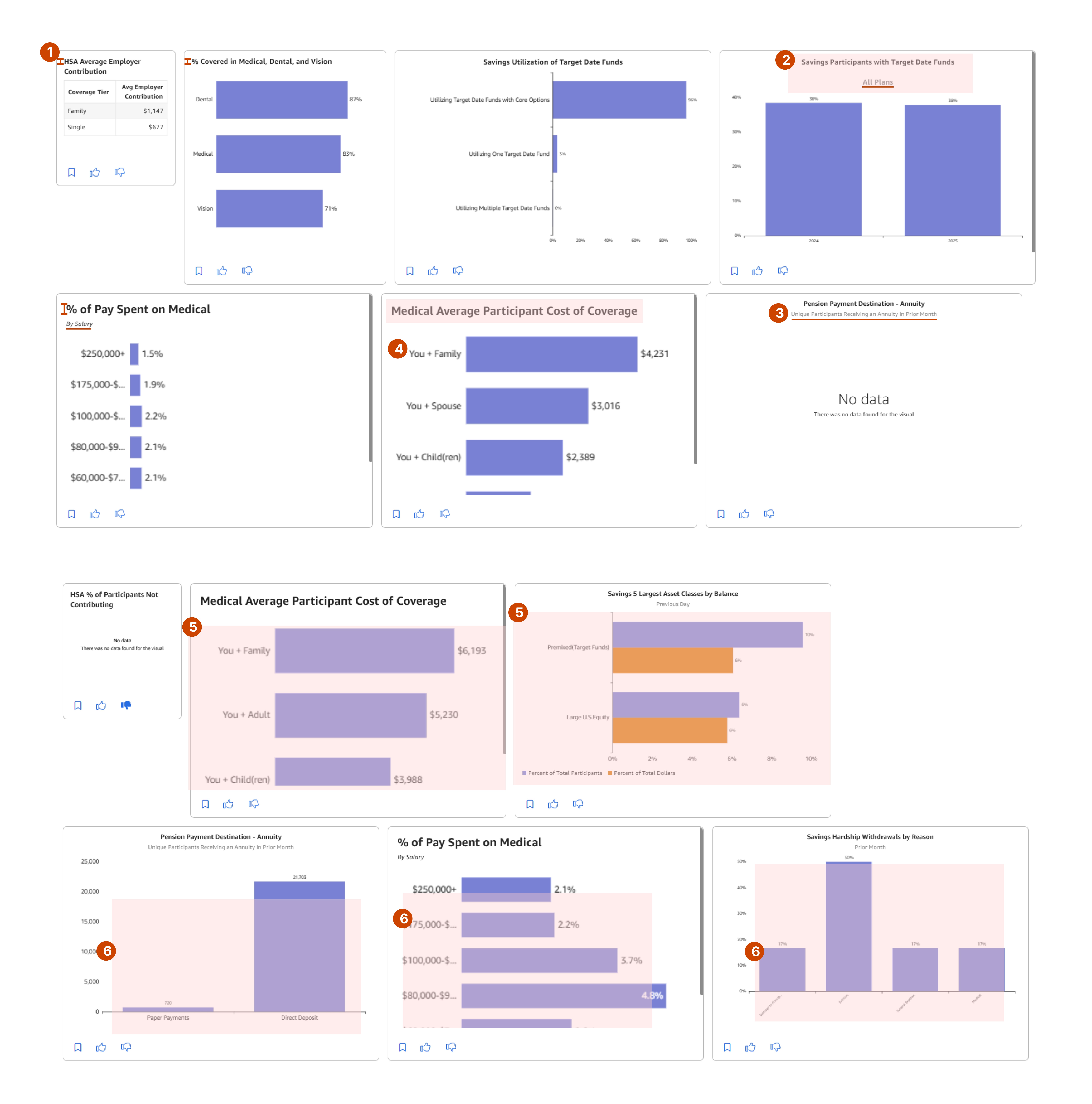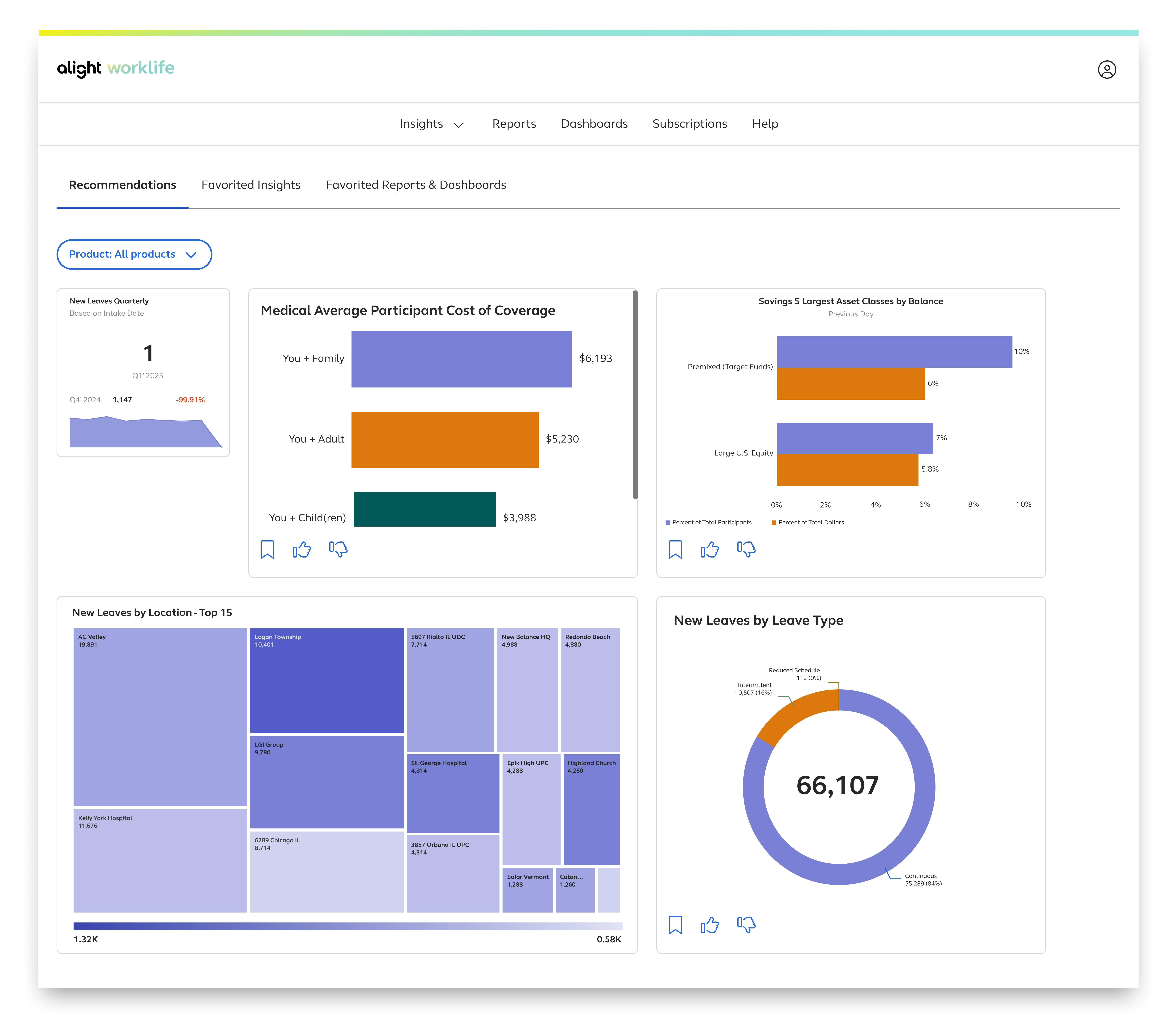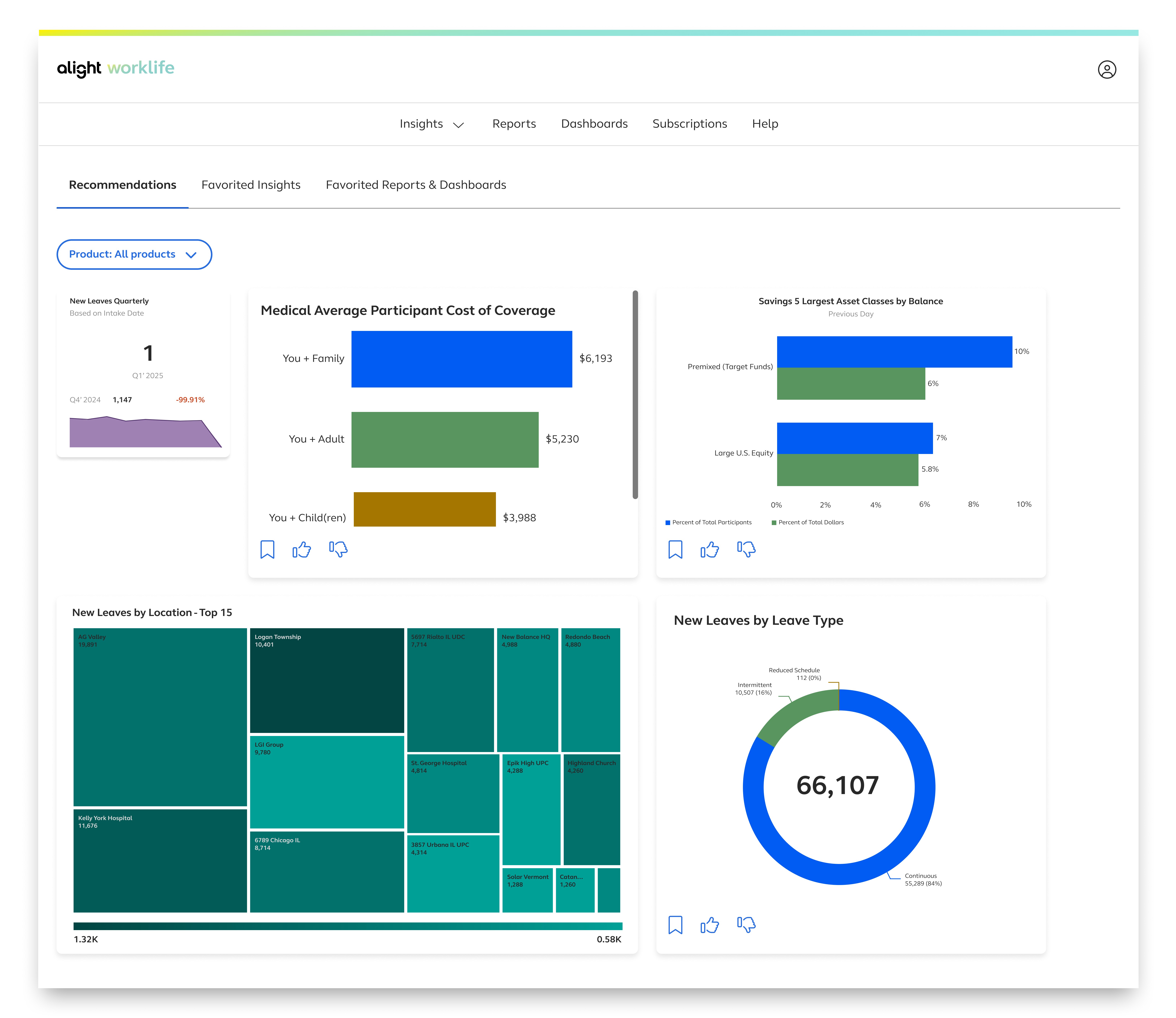 Alight Worklife Insights®️ is an analytics platform designed to help clients make sense of employee data across benefits, payroll, savings, and more. Within the platform, users can access reports, structured collections of employee data, or dashboards, which present that data through meaningful visualizations like charts and graphs to support deeper analysis and decision-making.